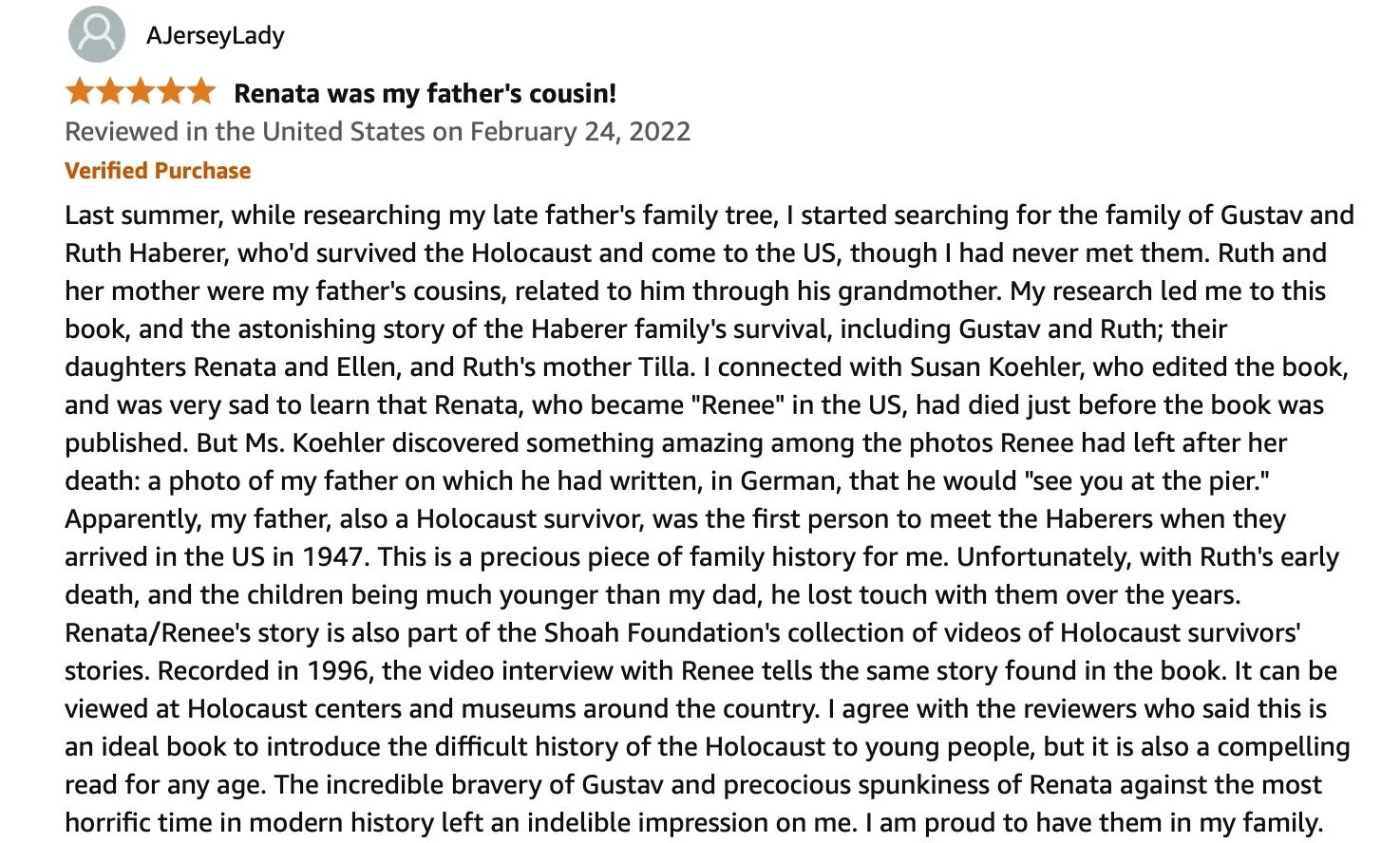 “A great read that provided meaningful insights into the life of a Jewish family during the Holocaust. This book is meant for children, but an interesting read for all.”
